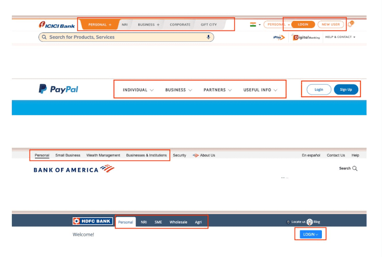 For example, there is a reason why most of the top banking websites have Personal/Business type categories and the Login/SignUp option right at the top within the header section.